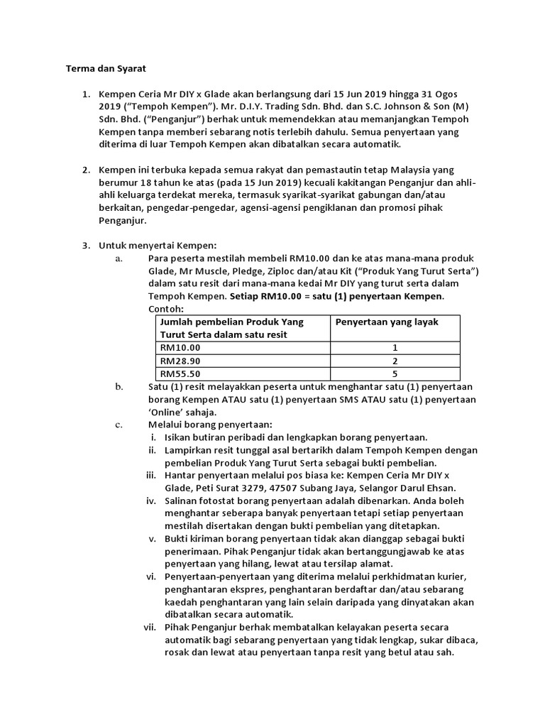 Kempen Ceria MRDIY x Glade Peti surat 3279 47507 Subang Jaya Selangor Darul Ehsan. Method 1 Online Contest Form - Scan barcode on A5 tent card provided at cashier. KEMPEN CERIA MRDIY X SC JOHNSON Now you can win a car just by spending minimum RM10 in a single receipt on any Sc Johnson brand Glade MrMuscle Ziploc Kit.